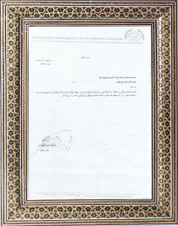 پس از سالها مطالعه تحقیق و تجربه در کشورهای اروپایی و کشورهای حاشیه خلیج فارس واحد R&D شرکت زیست آنزیم شیمی با برند وارنا از سال ۱۳۸۹ فعالیت رسمی خود را در زمینه اصلاح آردهای ایران آغاز کرد و از آن سال تا کنون این شرکت خدمات ارزنده و شایانی جهت اصلاح انواع آرد های ضعیف به صنعت آردسازی ایران نموده است این شرکت افتخار دارد خدمات مشاوره ای و اصلاح آردهای تولیدی کارخانهجات را در سراسر کشور متقبل شود.