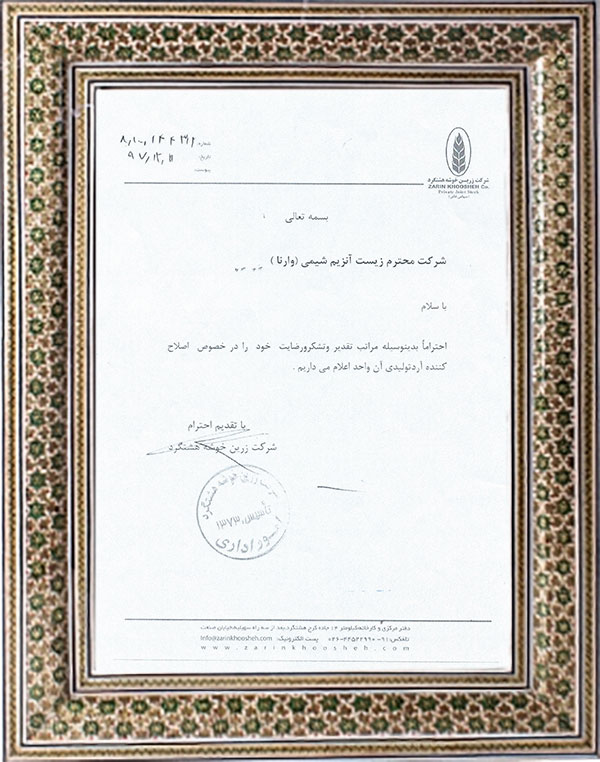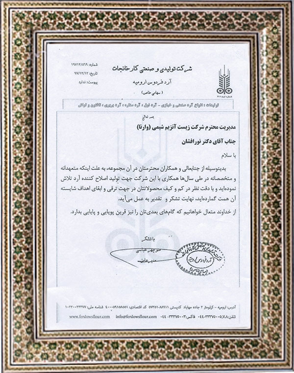 شرکت زیست آنزیم شیمی با برند وارنا از سال ۱۳۸۹ فعالیت رسمی خود را در زمینه اصلاح آرد های ایران آغاز کرد